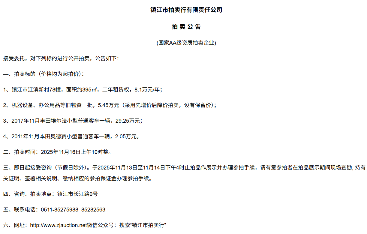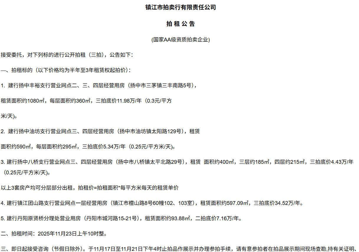 鎮江市拍賣行有限責任公司拍 租 公 吿(國家AA級資質拍賣企業)接受委托,對下列標的進行公開拍租(三拍),公告如下:—、拍租標的(以下價格均為半年至3年租賃權起拍價):1.  建行揚中豐裕支行營業網點二、三、四層經營用房(揚中市三茅鎮三豐南路5號),租賃面積約1080㎡,每層面積約360㎡,三拍底價11.98萬/年(0.3元/平方米/天)。2.  建行揚中油坊支行營業網點三、四層經營用房(揚中市油坊鎮太陽路129號),租賃面積約590㎡,每層面積約295㎡,三拍底價5.34萬/年(0.25元/平方米/天)。3. 建行揚中八橋支行營業網點三、四層經營用房(揚中市八橋鎮太平北路29號),租賃  面積約400㎡,三層約185㎡,四層約215㎡,三拍底價4.43萬/年(0.25元/平方米/天)。以上3套房產均可分層部分出租,拍租價=拍租面積*每平方米每天的租賃單價4. 建行鎮江團山路支行營業網點一層經營用房(鎮江市檀山路8號60幢102、103室),租賃面積約597.09㎡,三拍底價34.52萬/年。5. 建行丹陽原賢橋分理處營業用房(丹陽市城河路15-21號),租賃面積約93.88㎡,二拍底價7.16萬/年。二、拍租時間:2025年11月23日上午10時整。三、即日起接受咨詢(節假日除外)。于11月17日至11月21日下午4時止拍品作展示并辦理參拍手續,請有意參拍者在拍品展示期間現場查勘,持有關證明、簽署相關說明、繳納相應的參拍保證金辦理參拍手續。四、咨詢、拍租地點:鎮江市長江路9號五、聯系方式:0511-85275988   13655299933楊先生六、網址:http://www_zjauction_net.lswuwang.cn;微信公眾號:搜索“鎮江市拍賣行” 拍品清單2025.11.23序號名稱起拍價(元)標的說明1建行揚中豐裕支行營業網點二、三、四層經營用房(揚中市三茅鎮三豐南路5號),租賃面積約1080㎡,每層面積約360㎡三拍底價11.98萬/年(0.3元/平方米/天)1、1-3號房產均可分層部分出租,拍租價=拍租面積*每平方米每天的租賃單價;2、意向競拍人在拍賣前需持營業執照或身份證與委托方說明租賃房產經營業態,確定意向后出具房產承租用途承諾書,經委托方審核后,方可交納保證金參加競拍;3、租賃期限為半年至3年(承租方與出租方協商而定),承租方每半年或一年結付租金,租賃期間的水、電費用及其它相關費用均由承租方承擔;4、承租方不得用于經營和保管危險物品,不得用于開設餐飲、娛樂等可能嚴重影響消防安全、運營安全的經營業態,不得用于經營委托貸款、小額貸款等可能冒用委托方名義,帶來聲譽風險的經營業態。租賃期內,承租方不得破壞墻體結構,自行成就消防、安全等使用條件,不得擅自將租賃房屋轉租、轉讓給他人使用,否則委托方有權收回房屋;5、拍租成交后,承租方將租金交至出租方指定賬戶,傭金交至拍賣方賬戶(拍租傭金為該房屋一個月租金)。承租方憑租賃合同無息退還保證金。2建行揚中油坊支行營業網點三、四層經營用房(揚中市油坊鎮太陽路129號),租賃面積約590㎡,每層面積約295㎡三拍底價5.34萬/年(0.25元/平方米/天)3建行揚中八橋支行營業網點三、四層經營用房(揚中市八橋鎮太平北路29號),租賃面積約490㎡,每層面積約245㎡三拍底價4.43萬/年(0.25元/平方米/天)4建行鎮江團山路支行營業網點一層經營用房(鎮江市檀山路8號60幢102、103室),建筑面積約597.09㎡三拍底價34.52萬/年5建行丹陽原賢橋分理處營業用房(丹陽市城河路15-21號),建筑面積約93.88㎡二拍底價7.16萬/年